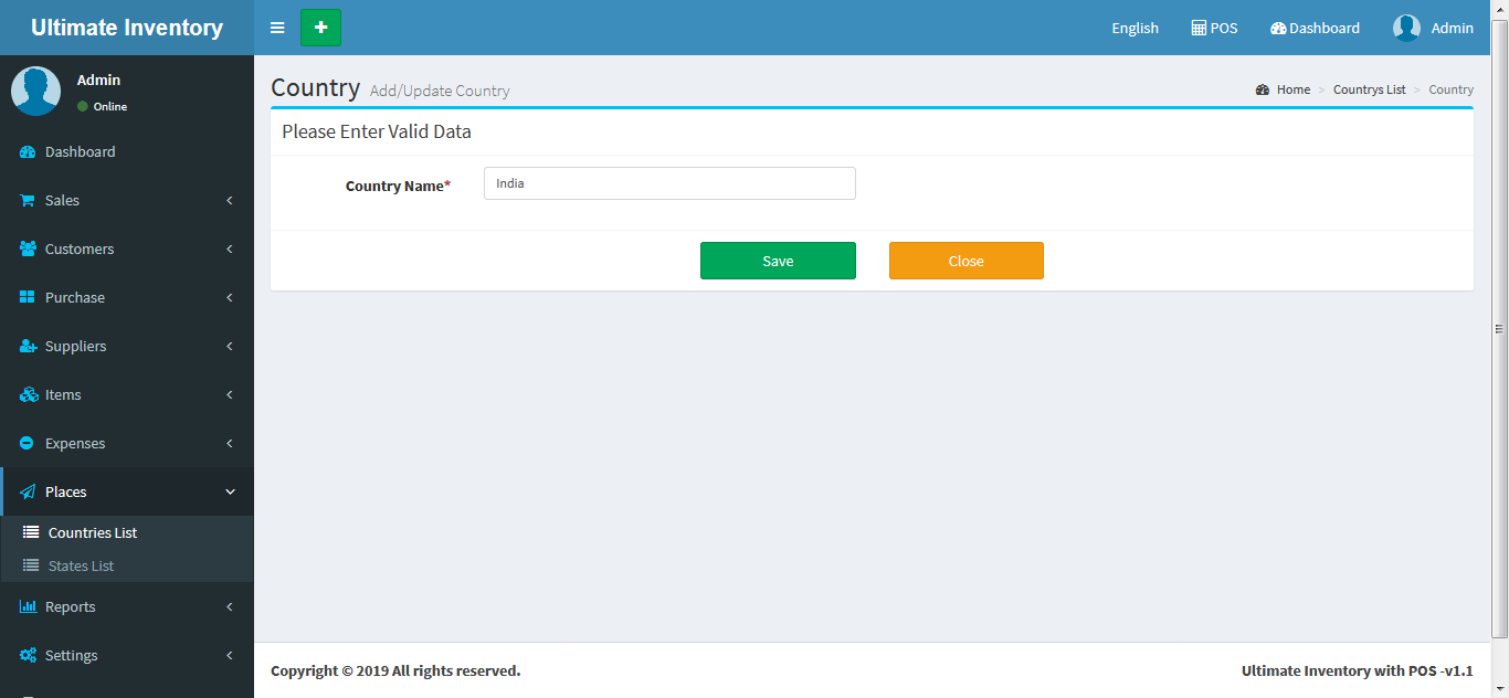 Adding a Country it's a very easy task. Enter Country name and click on Save button.
