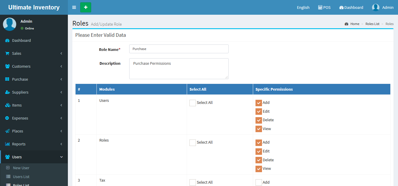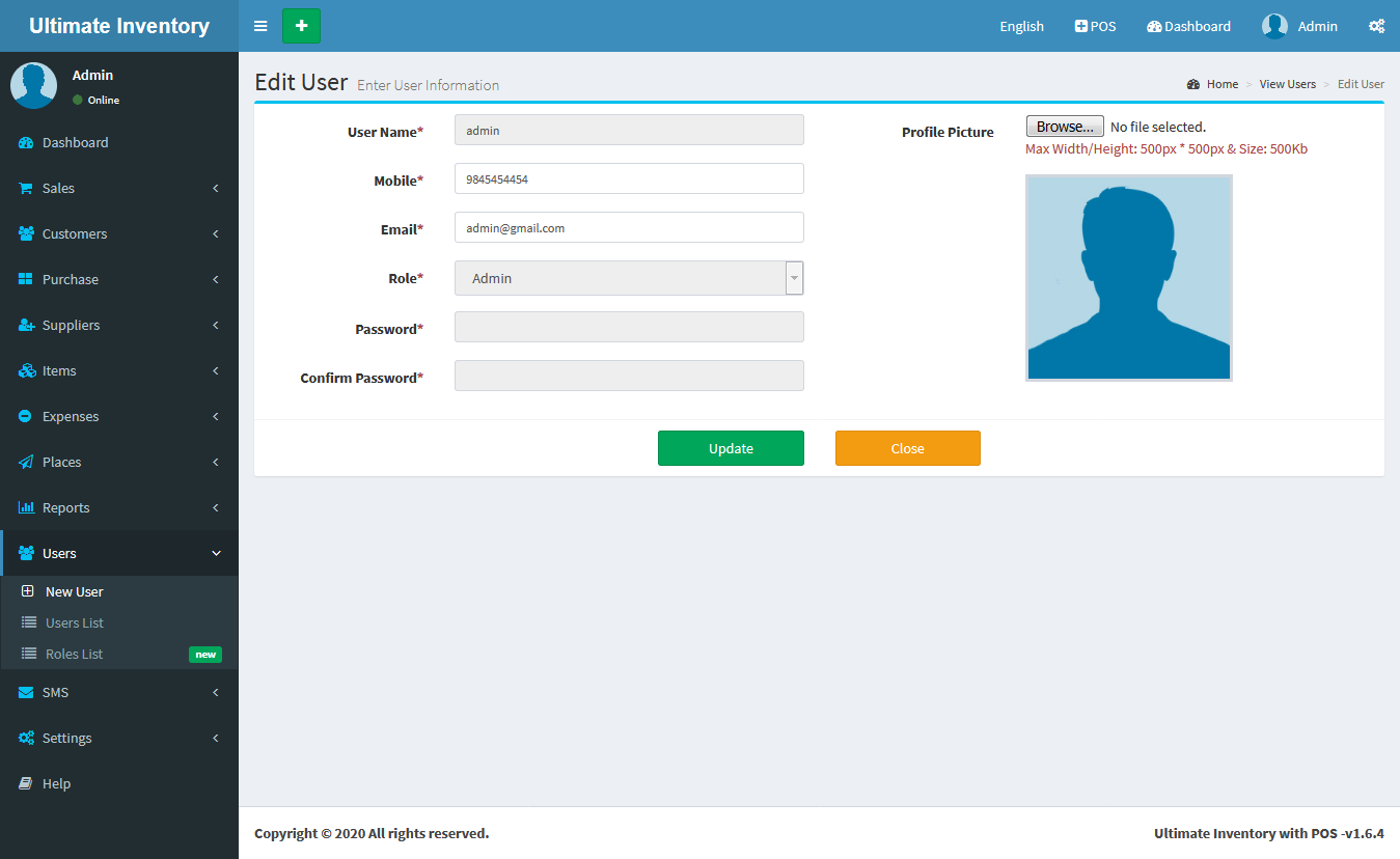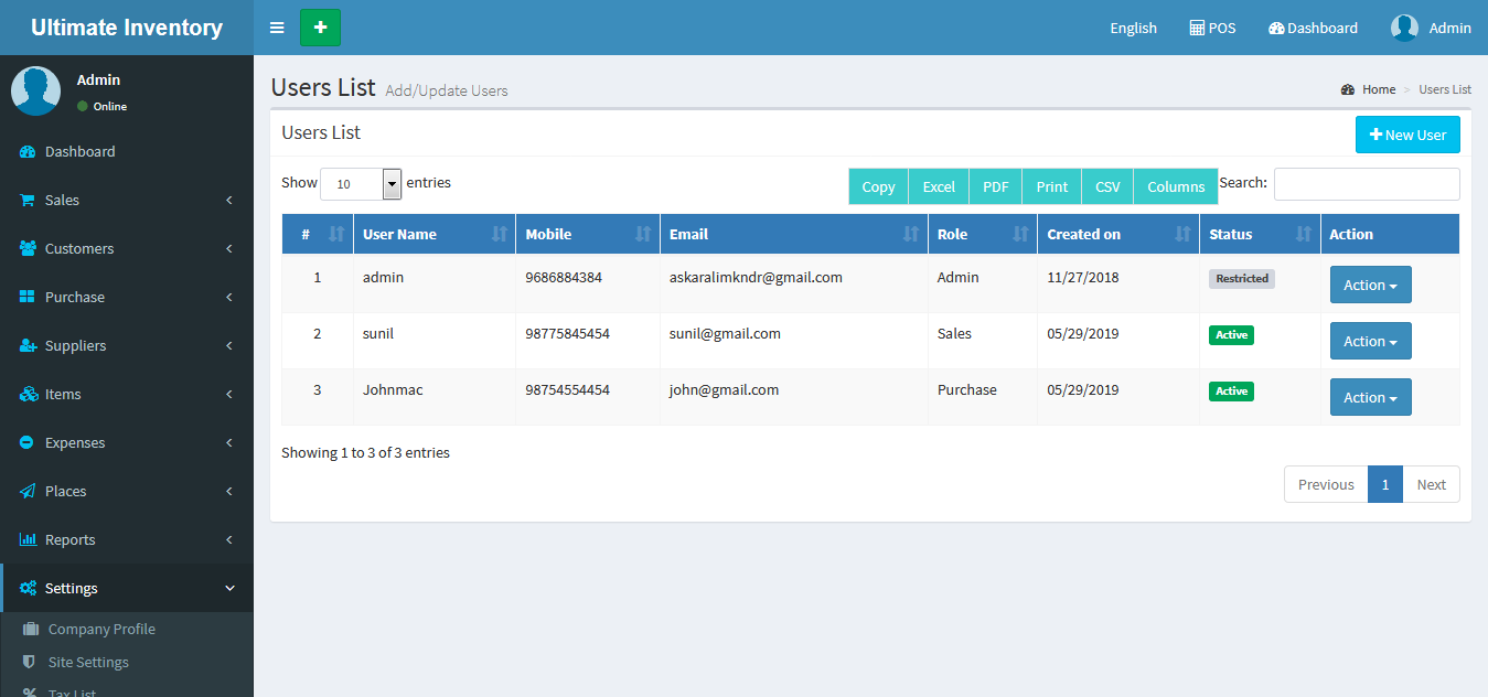 Adding a User it's a very easy task. Enter user name, Mobile number, Email ID, Role(Admin/Sales/Purchase), enter password and confirm the password fields of the new user and click on Save button.