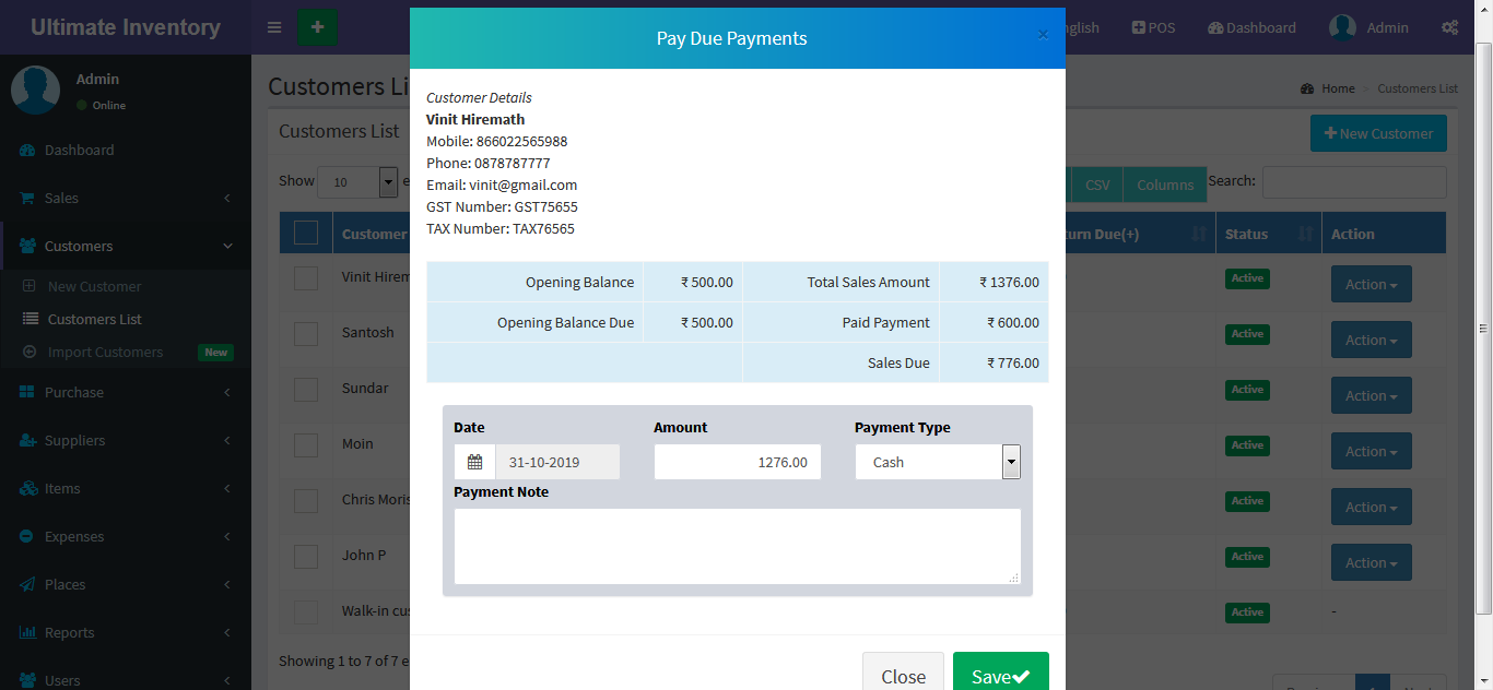 Adding a Customers it's a very easy task. Enter Customer name, Mobile, Phone, Email, GST Number, TAX Number,