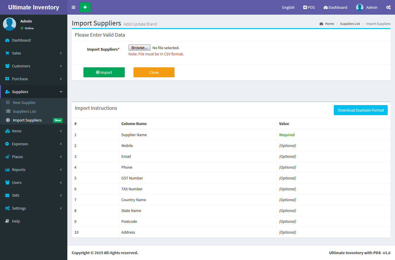 Suppliers -> Import Supplier