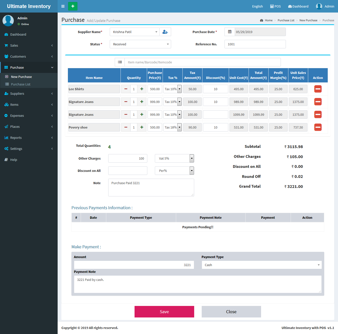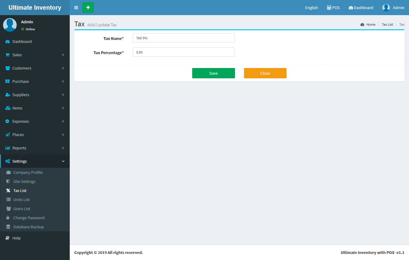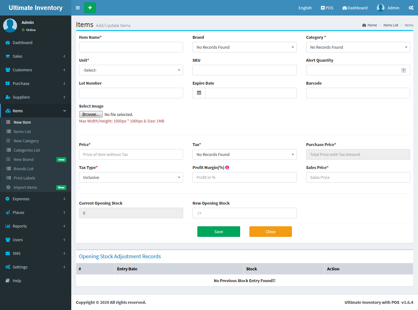 Adding a Items it's a very easy task. Enter Item name, Select Category, Unit, SKU(Optional Field), Alert Quantity(Optional field), Select Image(Optional field),Purchase Price(Without Tax), Select Tax, Tax Type(Inclusive / Exclusive), Profit Margin(in Percentage %) , Available/Current Stock(+/-) (Optional Field), Add Lot number(Optional), Expired Date(Optional) and click on Save button.