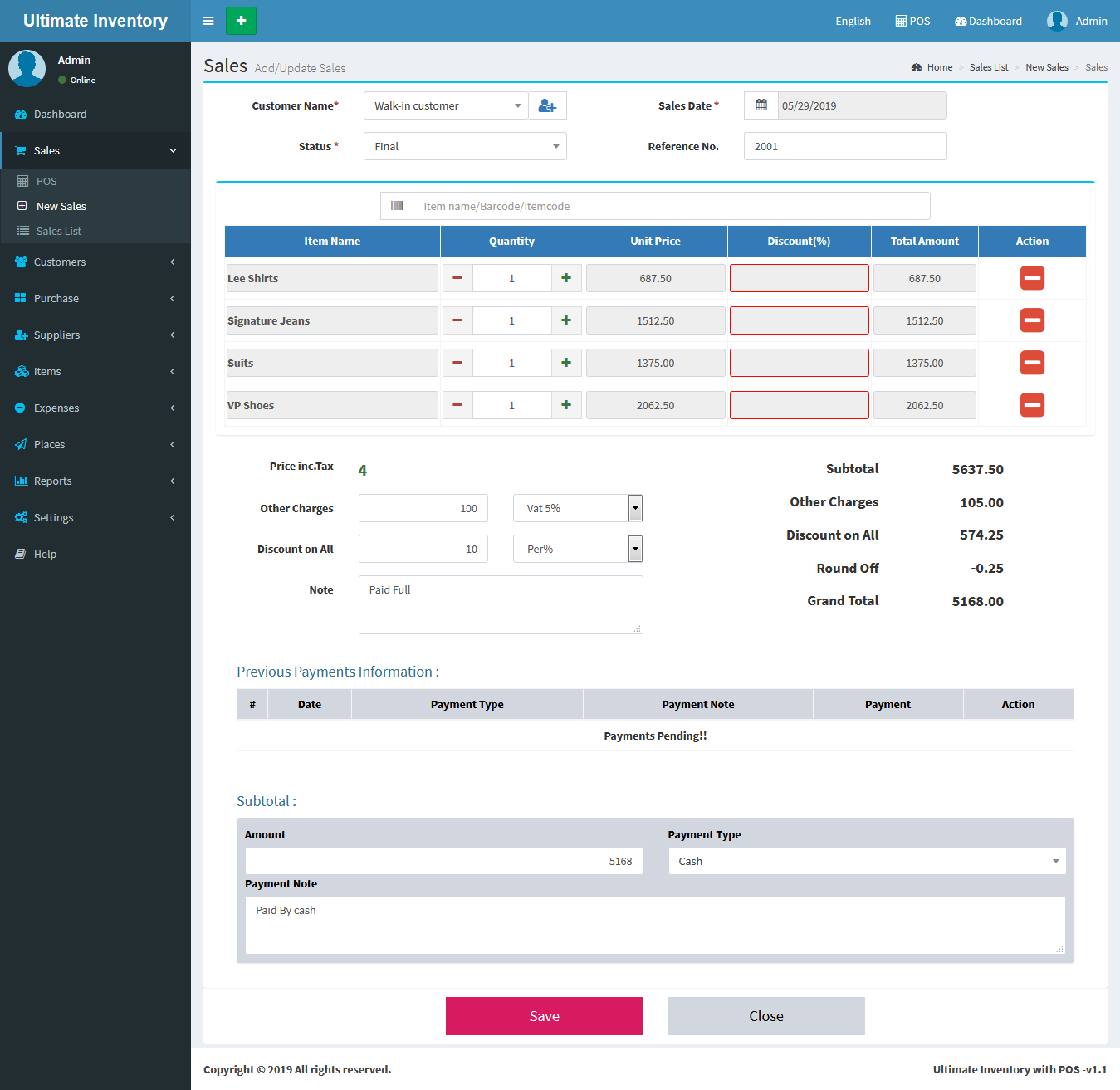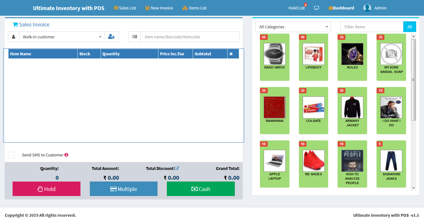 Inventory with POS is a web application software user can track Items & Stock Items, Manage Suppliers, Manage Customers, Items Categories, Sales, Purchase, Manage users and get all the reports which are require to your office and many more features.
