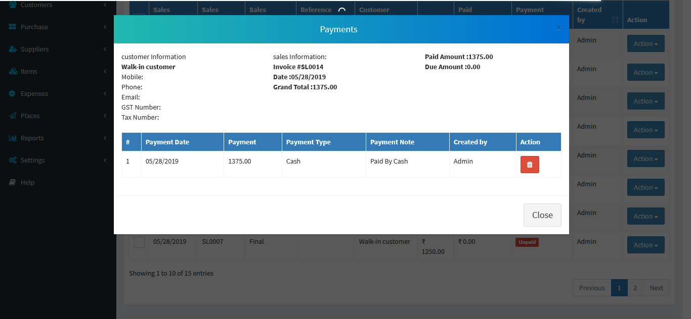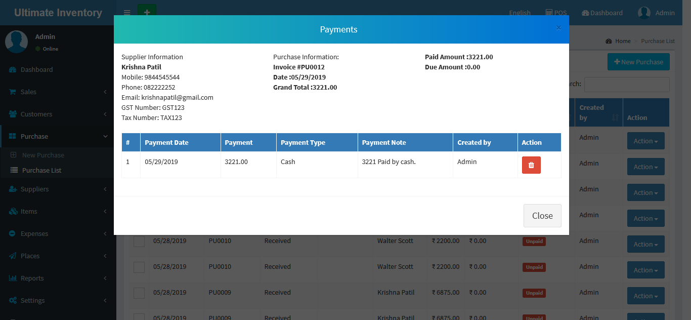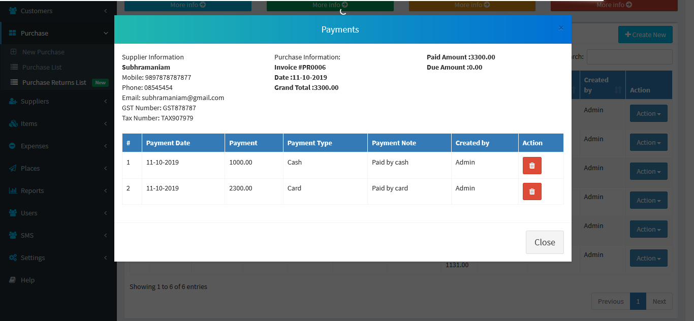 You can view the all the added Purchases list and you can Purchases list by Delete & Edit actions.