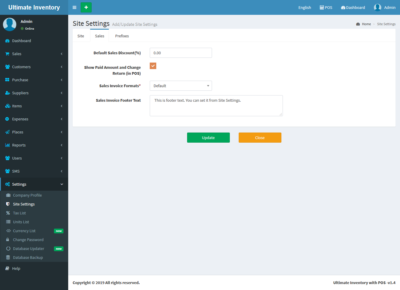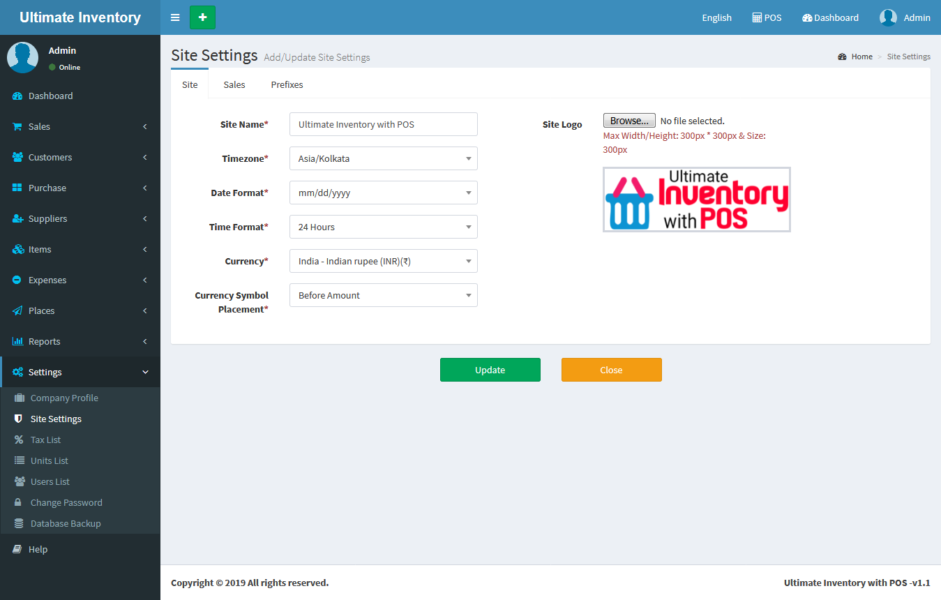 Site: Update Site Name, Timezone, Date Format, Time Format, Currency, Currency Symbol Placement & Site Logo.