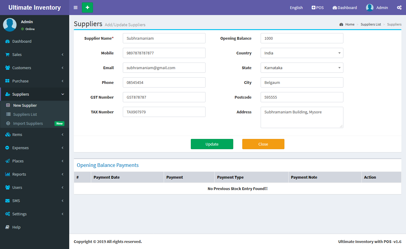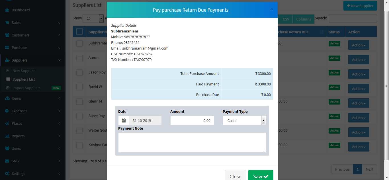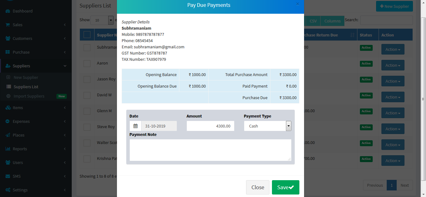 Adding a Suppliers it's a very easy task. Enter Supplier name, Mobile, Phone, Email, GST Number, TAX Number,